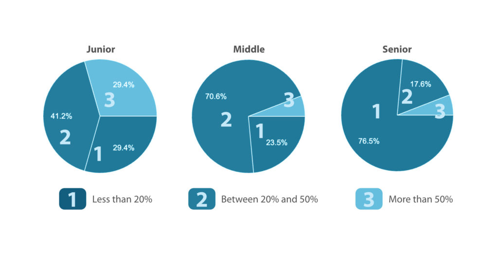 Most of the developers in Ethiopian IT companies are with the middle experienced level of 3-7 years working expereinces. About 18% of the developers are senior level with an experience of 7 and more years. This will change over the next three years when a large portion of the junior developers will reach more than 3 years expereinces (then middle level) and a large part of the today middle level developers will have more than 7 years of working experiences.