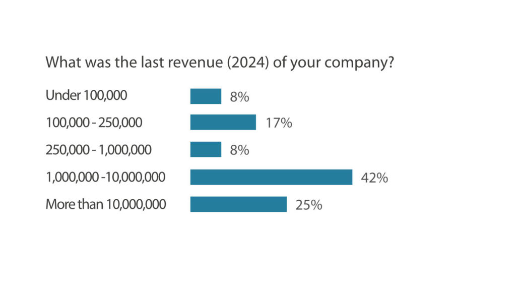 The majority of the participating companies have a revenue between 1 and 10 million USD in 2024 (42%), while 25% of the companies have had a revenue of more than 10 million USD.