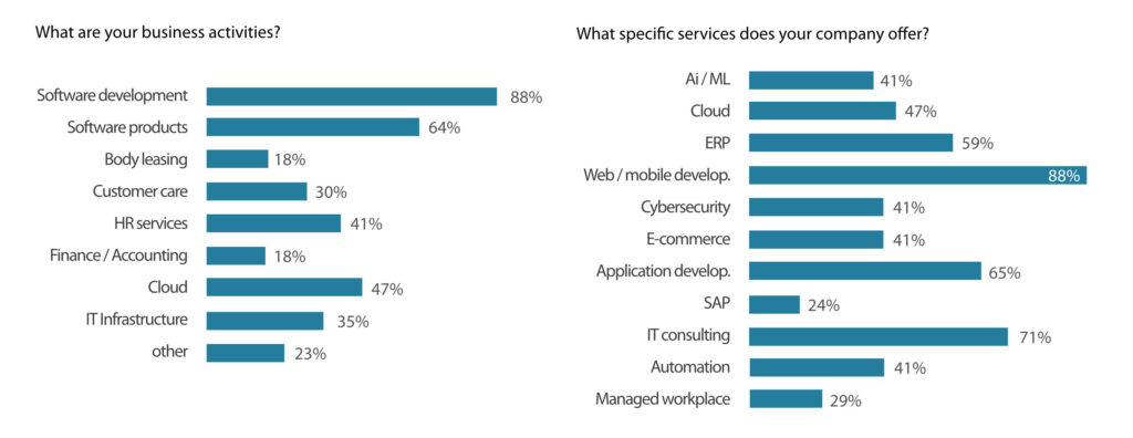 The majority of the companies offer software development services (88,2%), followed by software products (64%) and cloud services (47%), HR-services and IT-infrastructure services are popular too, with 41% and 35% of the companies offering them.
