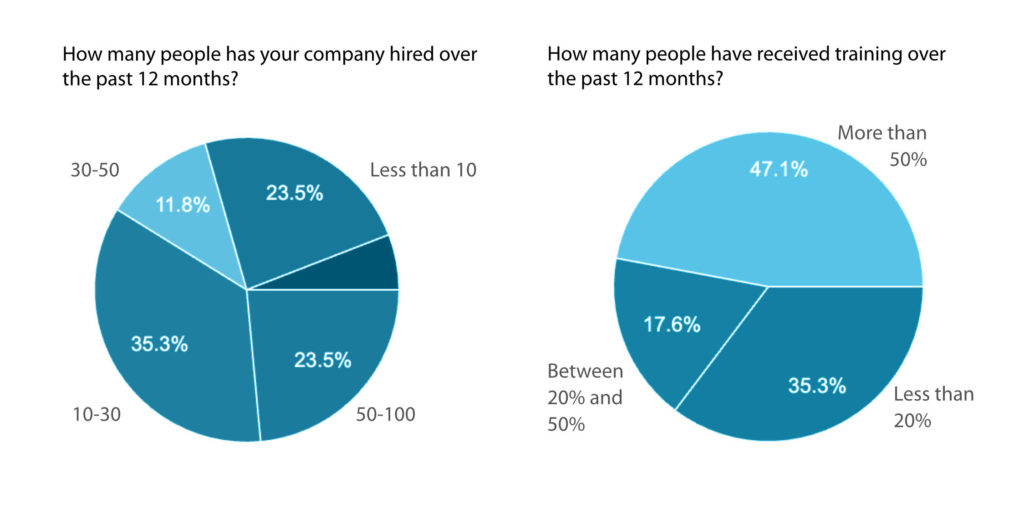 A large part of the companies (35%) have hired between 10 and 30 people over the last 12 months, followed by 23,5% of the companies that hired between 50 and 100 people, 12% 30 and 50 people and another 23% have hired less than 10 people. A small part hired more than 100 people within the last 12 months.